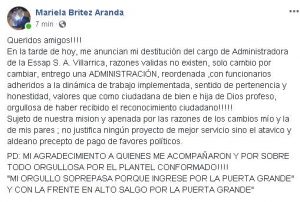 La Administradora de la ESSAP en Villarrica Lic. Mariela Brítez, fue destituida de su cargo según informó la misma en su cuenta de facebook: «me anuncian mi destitución del cargo de Administradora de la Essap S. A. Villarrica, razones validas no existen, solo cambio por cambiar» afirma parte del posteo de la funcionaria.
