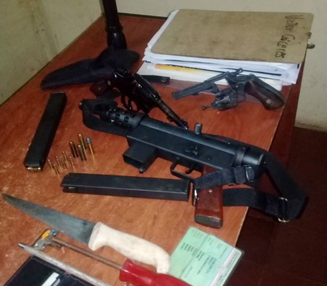 Se incautó la camioneta de la marca Chevrolet modelo S10, con chapa CDE450, un revólver calibre 38 y otro de calibre 22, una subametralladora calibre 9 mm, un cuchillo y una chaira para carnicería con mango de color negro, y un teléfono celular.