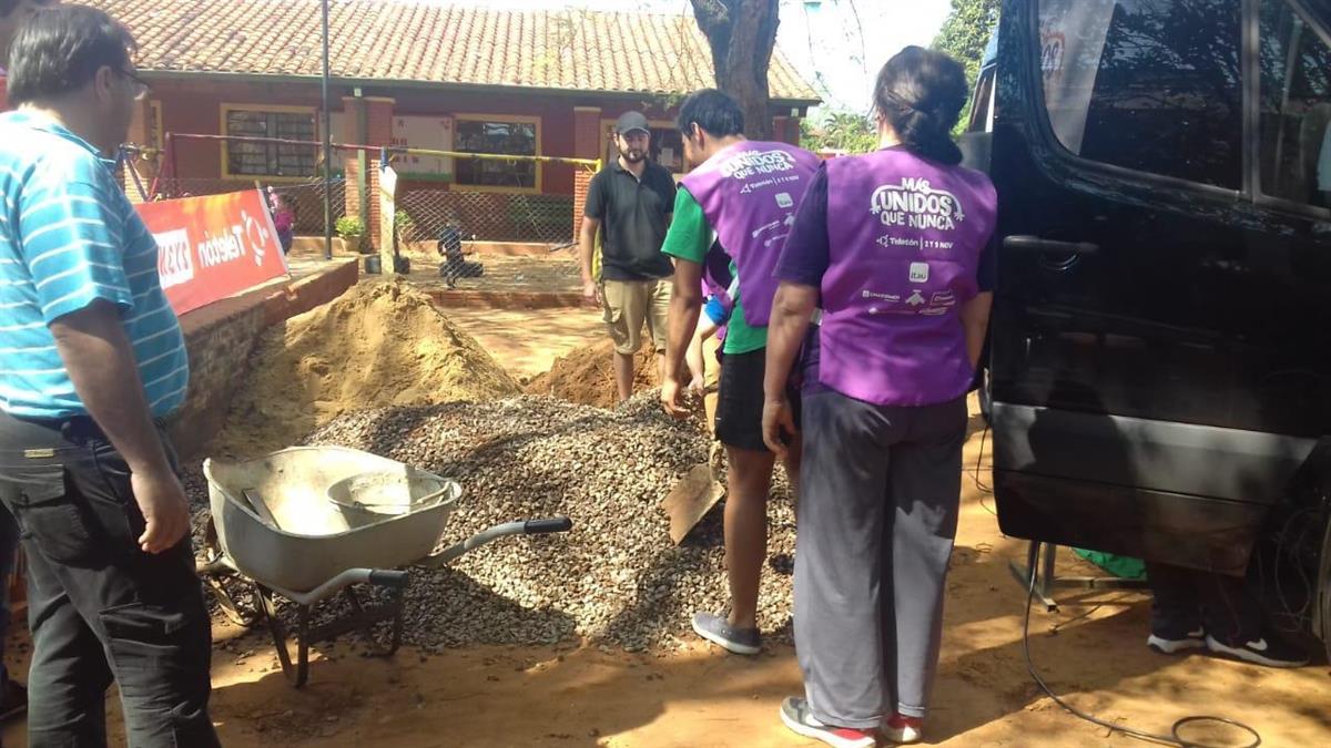 La Gira Teletón este año adoptó un nueva modalidad, están iniciando la construcción de una rampa en el Ciclo 2 del Centro Regional de Educación Natalicio Talavera de Villarrica. En lugar estuvieron trabajando integrantes del Voluntariado Gua’i, y figuras de los medios.
