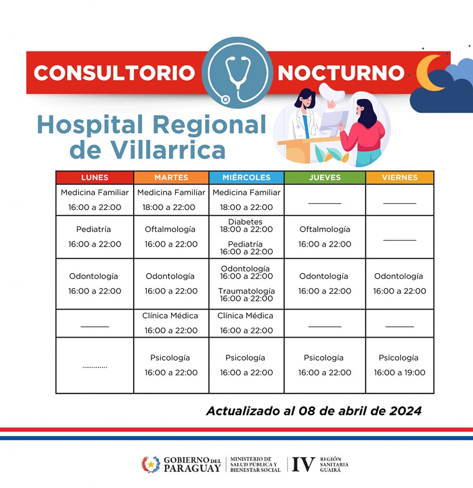 El Dr. Cristian Matto, director del Hospital Regional de Villarrica, informó que buscan tener por la noche, la misma cartera de consultorios habilitados de día. Actualmente ofrecen consultas en medicina familiar, pediatría, oftalmología, diabetes, odontología, clínica médica, psicología, y traumatología.