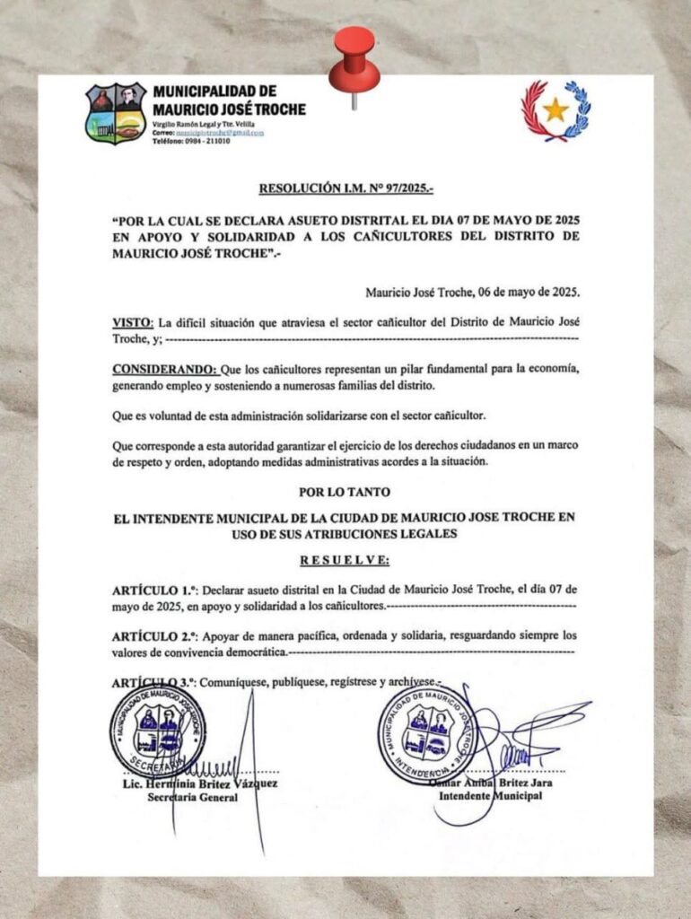 También la Municipalidad de Mauricio José Troche declaró asueto para acompañar la movilización mañana miércoles 7 de mayo .