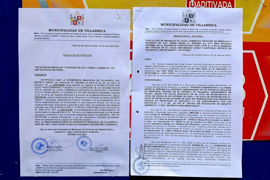 El abogado Víctor Escobar, asesor jurídico de la Municipalidad de Villarrica, informó en contacto con Radio Guairá que el dia 30 de julio procedieron a clausurar de forma indefinida una estación de servicios que pertenece al grupo H. Unger. La medida obedece a una notificación del MADES que instruyó un sumario a la mencionada firma.