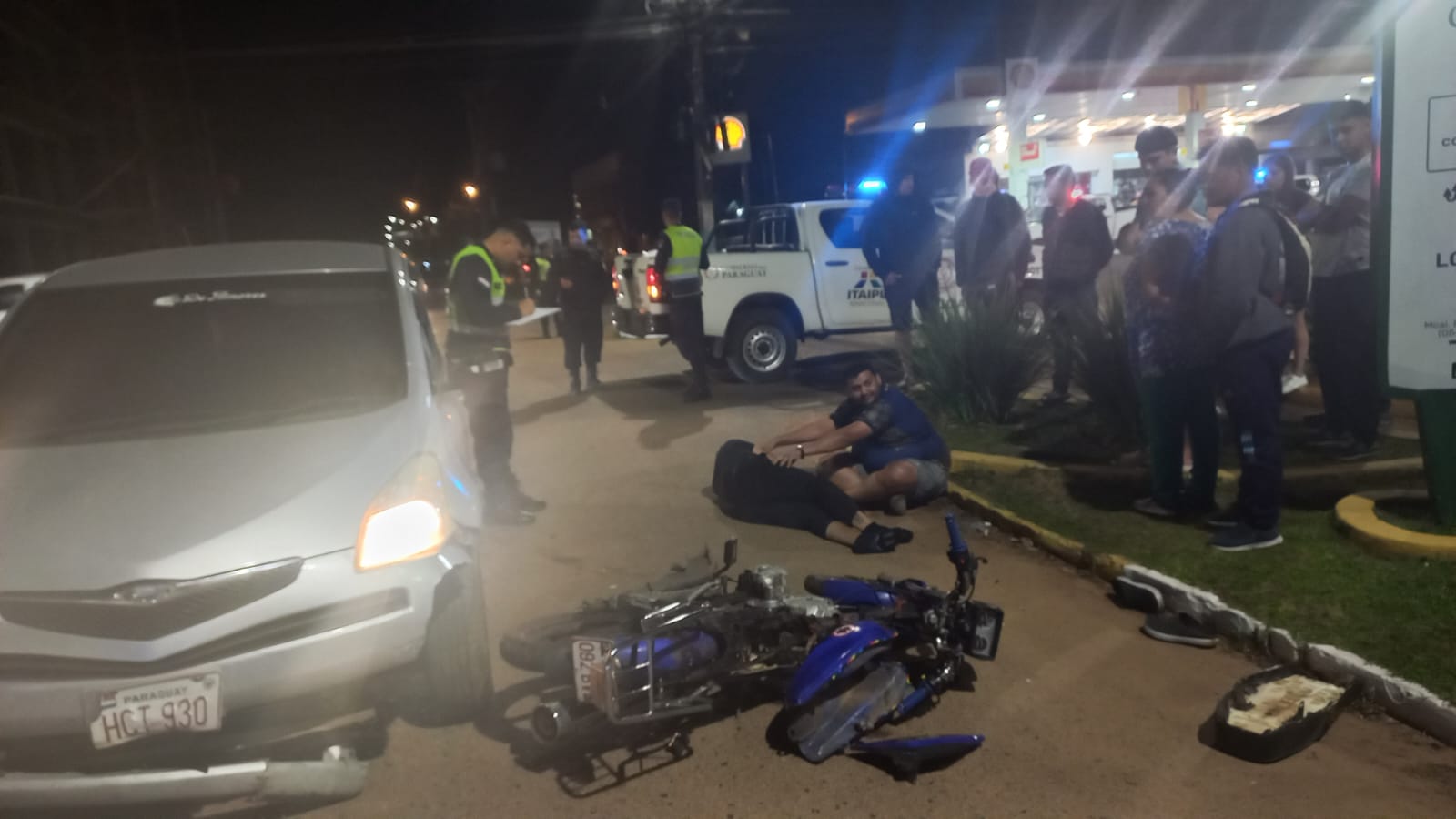 Se vieron involucrados un automóvil de la Marca Toyota, Modelo Ractis, Año 2006, Color plata, guiado en el momento por JUAN ALBERTO URUNAGA, paraguayo, soltero, de 33 años de edad, medico, y una motocicleta de la Marca Kenton, Modelo GL150 cc, Color Azul, Año 2017, guiado en el momento por HUGO GABRIEL BÁEZ ALMADA, paraguayo, soltero, de 27 años de edad, personal militar, quien sufrió lesiones, mientras que los vehículos resultaron con daños materiales.