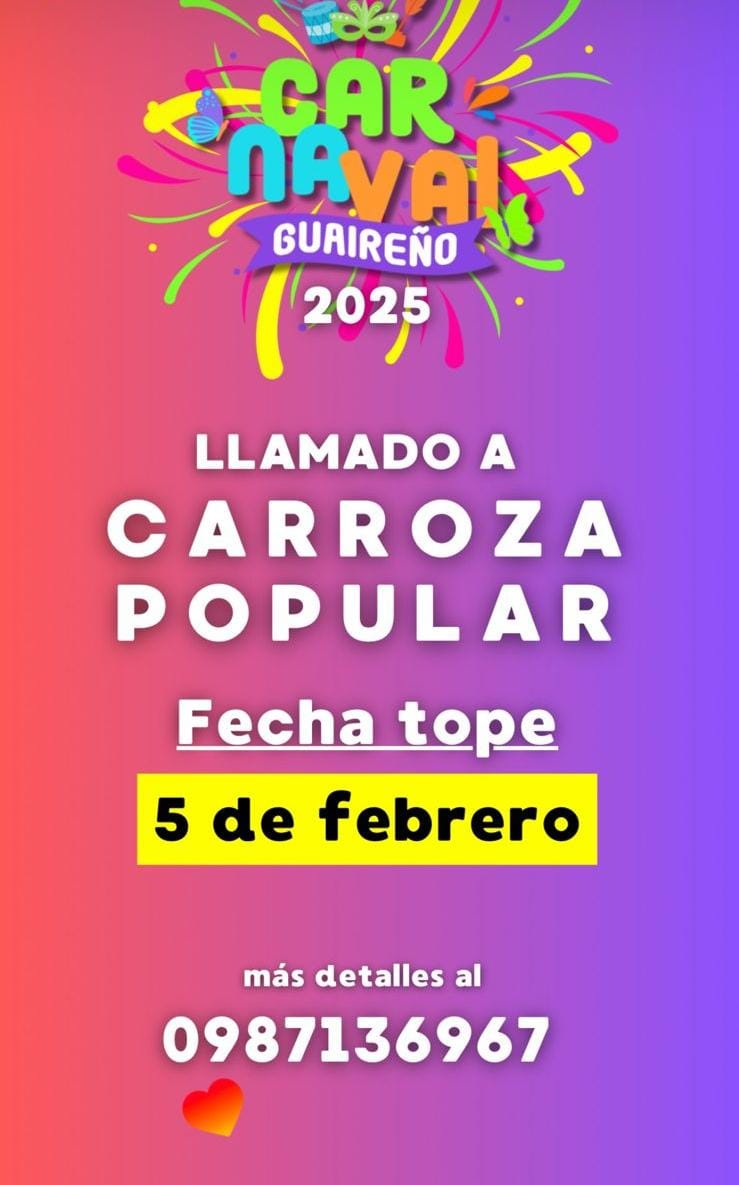 La Comisión del Carnaval Guaireño se pronunció tras la difusión de un flyer por parte de un ciudadano del barrio Ybaroty, en el que denunciaba que su comunidad había sido dejada de lado para el carnaval. Desde la comisión aclararon que, desde el lanzamiento del evento, siempre se invitó a todos los barrios y ciudadanos a participar mediante inscripción previa, con el objetivo de garantizar una mejor organización y coordinación de las comparsas y carrozas. Para inscribirse, los interesados pueden comunicarse al 0987 137 967 o a través de las redes sociales oficiales de la comisión en Facebook e Instagram.