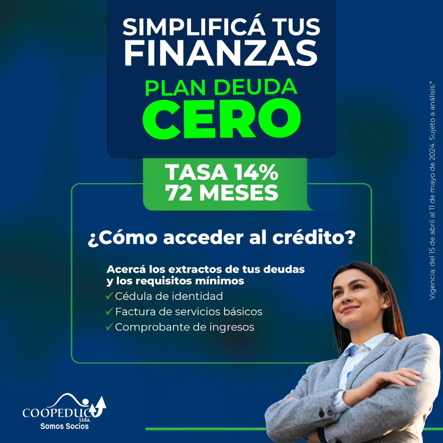 La Lic Viviana Blanco, de la Coopeduc explicó que el plan deuda cero, otorga a los socios la posibilidad de la obtención de un crédito para saldar las deudas, con plazo de de hasta 72 meses y con una tasa de interés de 14 %.