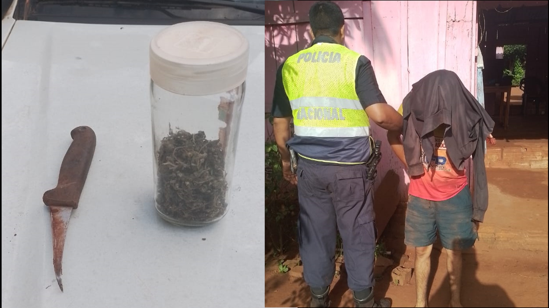 Se trata de RODRIGO FABIAN LOPEZ MIRANDA, paraguayo, soltero, 20 añosde edad, domiciliado en Yroysa 3ra línea, del poder del mismo fue incautado un cuchillo puntiagudo y un frasco de vidrio que contenía en su interior supuesta marihuana. Resultando victima su pareja sentimental