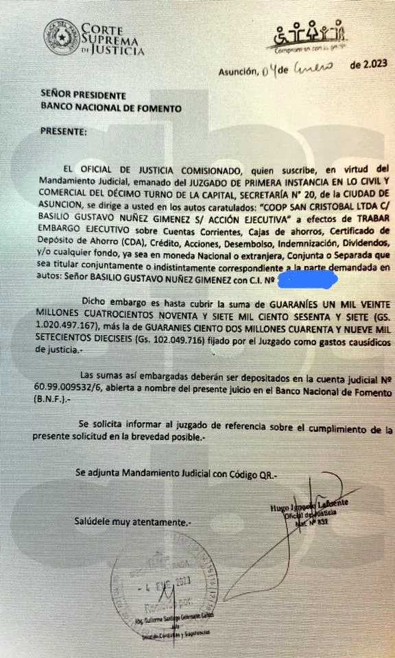 El mandamiento judicial de embargo fue emitido por el Juzgado de Primera Instancia en lo Civil y Comercial del Décimo Turno de la Capital, Secretaría N° 20 de Asunción, sobre autos caratulado como «COOP SAN CRISTÓBAL LTAD C/ BASILIO GUSTAVO NÚÑEZ GIMÉNEZ S/ ACCIÓN EJECUTIVA (sic)», según consta en el documento del Poder Judicial al que accedió ABC.