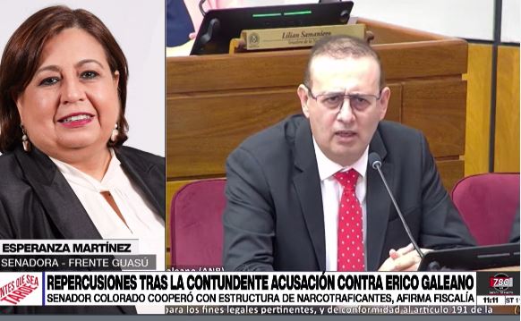 La senadora, al profundizar más sobre la situación creada con la acusación contra Erico Galeano, advirtió que estamos entrando en una situación de un estado casi fallido donde pareciera que el narcotráfico, crimen internacional y lavado, controlan al estado y sus instituciones.
