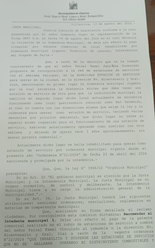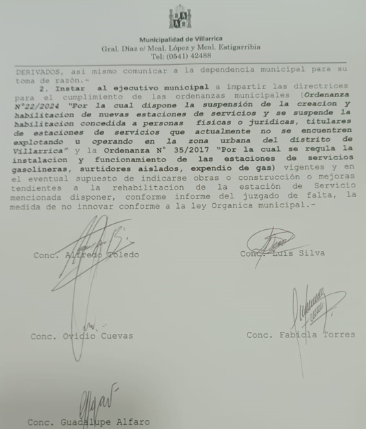 El abogado Alfredo Toledo Bruno, explico en contacto telefónico con Radio Guairá, que de los temas abordados en la sesión de la Junta Municipal de Villarrica el martes, lo más importante fue la discusión sobre la nota presentada por el señor Humberto Unger en representación de la Firma UNFI S.A., contra el pedido de incorporación a la red de estaciones de servicio de Petropar, formulado por el señor Faizal Kamel, alegando que se viola una ordenanza municipal sobre la distancia mínima que debe haber entre una estación de servicios de otra.