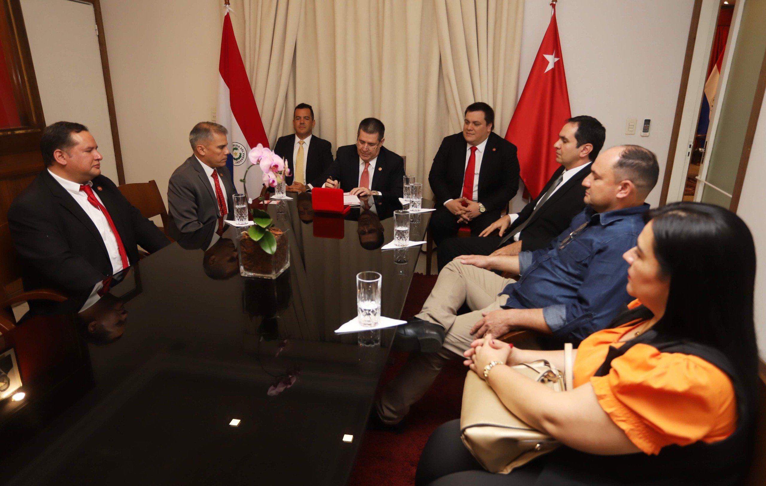 El presidente de la ANR, Horacio Cartes, recibió a Hugo Fugari, exapoderado del PLRA en Guairá y Ever Eugenio García, concejal municipal de Itape, (PLRA), quienes se suman a las filas del Partido Colorado, según público en su cuenta de X la ANR. en la foto se puede observar tambien Rodolfo Friedmann y César Luis Sosa sentados junto a Horacio Cartes, mientras firma el documento.