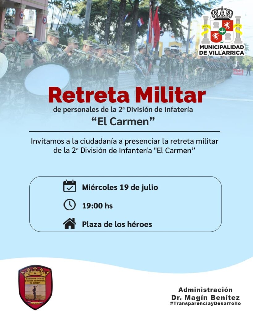 Por otro lado, la Dra. Ayala mencionó que se encuentran invitando a los ciudadanos para una Retreta Militar frente al Palacete Municipal este miércoles 19 de julio desde las 19:00hs., la actividad estará a cargo de la Segunda División de Infantería «El Carmen».