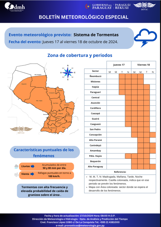 La Dirección de Meteorología dio a conocer un boletín especial, donde anuncia posibles lluvias y tormentas electricas, con ráfagas de viento que podrían alcanzar en algunos puntos los 100 kilómetro por hora. El meteorólogo Eduardo Mingo informó en comunicación telefónica con Radio Guairá que la hora de llegada del fenómeno varía de acuerdo a la lugar, por lo que se publicó un mapa para tener una referencia, en Guairá podrían darse entre esta noche y la mañana del viernes.