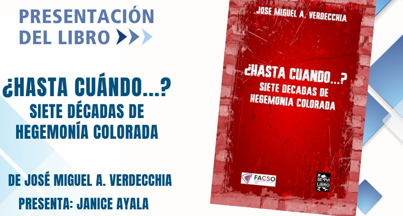 En el local de La Ferrer, será presentado hoy el libro «¿Hasta cuando…? Siete décadas de hegemonía colorada de José Miguel Verdecchia. La presentación estará a cargo de la señora Janice Ayala, en el mencionado local a las 19:00 hs, sobre la calle Ramiro Domínguez casi Ruy Díaz de Melgarejo de Villarrica.
