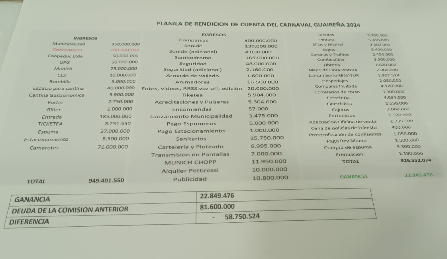 Explicó que hubo Gs. 949.401.550, mientras que los egresos suman 926.552.074. Entre los ingresos figuran Gs. 100.000.000 comprometidos por la Gobernación de Guairá, pero que aún no se ha cobrado.