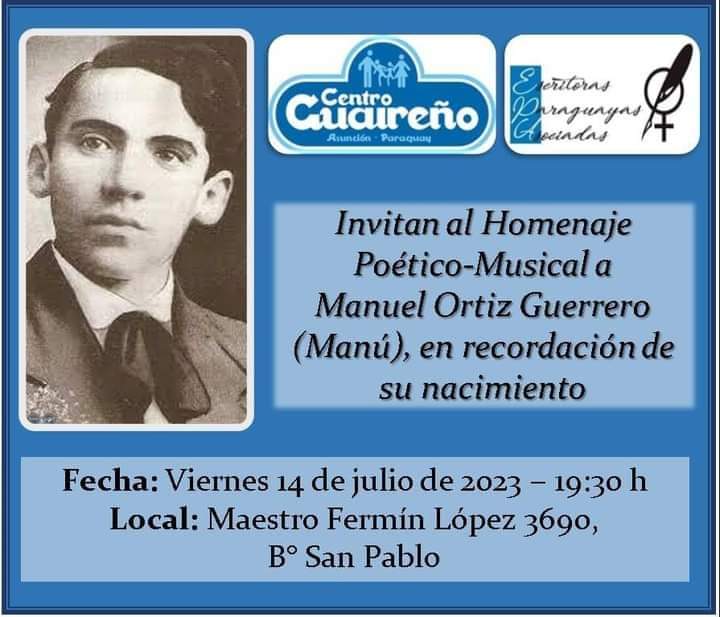 El Ing. Agustín Mendoza del Centro Guaireño informó que recordarán el nacimiento de Manuel Ortíz Guerrero y los 90 años de su partida, explicó que esta tarde realizarán la recordación en el Museo Maestro Fermín López del barrio San Pablo de Asunción, desde las 19:30hs.
