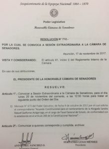 El titular de la Cámara Alta, Fernando Lugo, convocó a sesión extraordinaria en el Senado a fin de tratar el acuerdo constitucional para la Dra. Sandra Quiñonez, electa por el Ejecutivo para la Fiscalía General del Estado, que no se analizó ayer por falta de quórum.